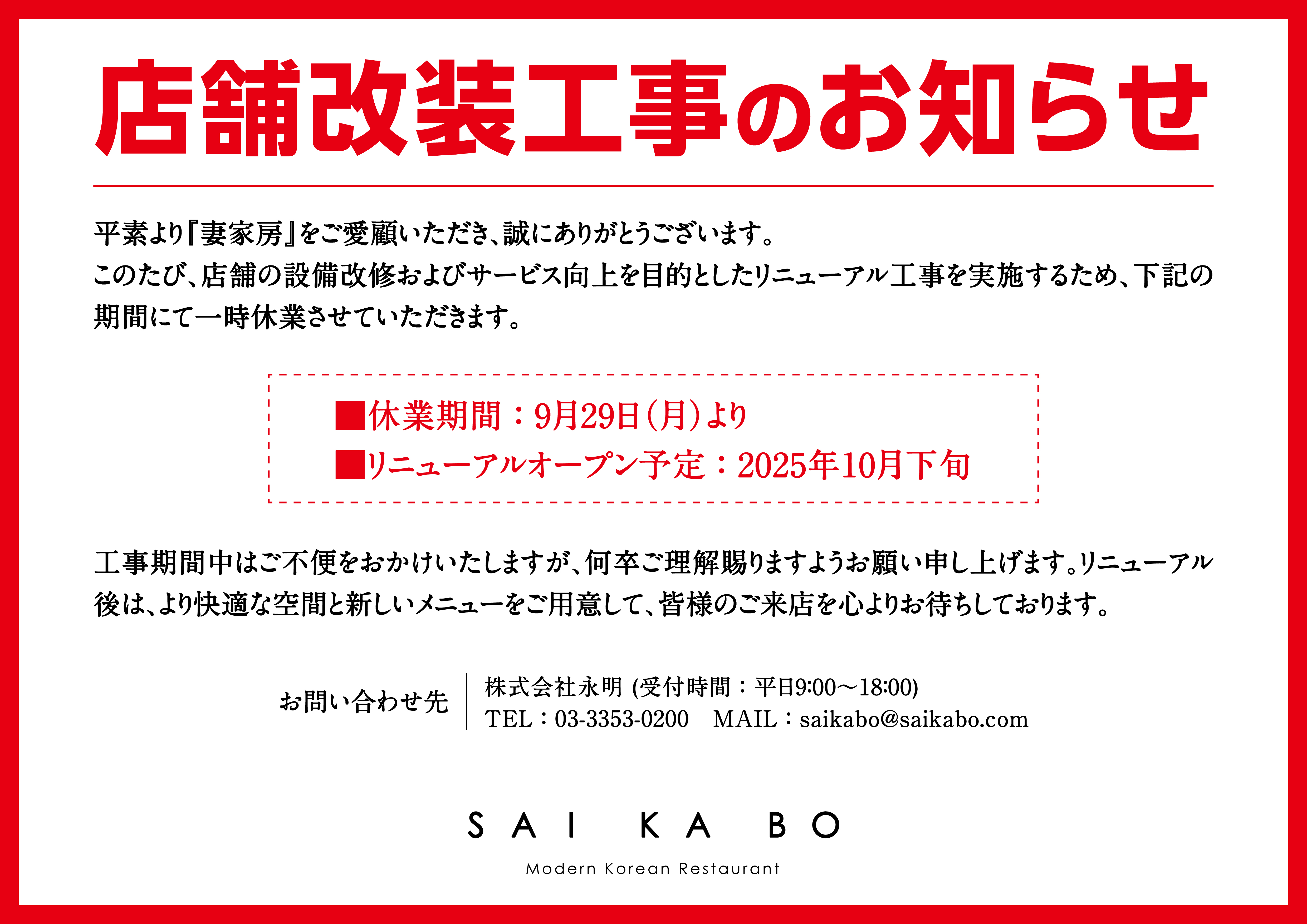 妻家房【SAIKABO】韓国家庭料理レストラン 韓国惣菜の販売